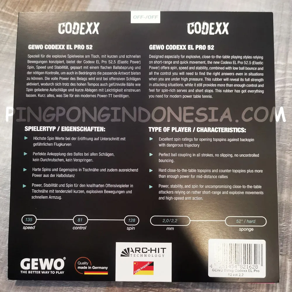 The new GEWO Codexx rubber series is designed as a perfect combination of European and Asian rubbers. It combines a dynamic, hard sponge with a slightly tacky, but still flexible top sheet (Architect Technology). The new GEWO Codexx rubbers are made for dangerous, point-winning close-to-the-table playing and produce tons of power and spin. Compared to the popular Nexxus Hard series, the new Codexx rubbers produce even more rotation, thanks to the slightly tacky top rubber sheet. Due to a longer dwell time (Arc Hit Technology), they also provide for more control in over-the-table situations.