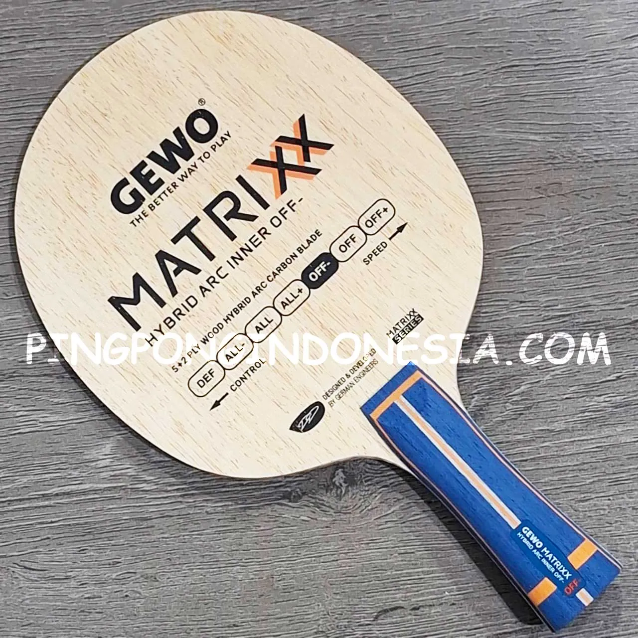Varian seri Matrixx yang sedikit lebih terkontrol menampilkan lapisan aramid-karbon hibrida yang membungkus lapisan inti kiri yang lebih lembut. Pengaturan ini memberikan dukungan yang sangat baik untuk strategi topspin, dan bahkan dari jarak menengah, GEWO Matrixx ARC Inner OFF memungkinkan permainan ofensif yang kuat. Lapisan koto luar memastikan stabilitas yang dibutuhkan untuk pukulan dekat meja, sementara lapisan ayous menengah memberikan sentuhan istimewa pada bilahnya – dan pada saat yang menentukan, tetap memberikan banyak tenaga. Formula Matrixx untuk sukses: sentuhan yang lebih lembut dan kontrol yang lebih baik daripada GEWO Matrixx ARC OFF, dengan penurunan kecepatan yang sangat minimal.